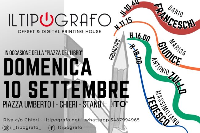 Il nostro stand alla Piazza del Libro 2023 ha visto per tutto il giorno l’avvicendarsi dei nostri autori. La Casa Editrice EDITO aveva infatti organizzato eventi di firmacopie-incontro con Dario Franceschi, Marisa Giudice, Antonio Zullo e Massimiliano Tedesco.